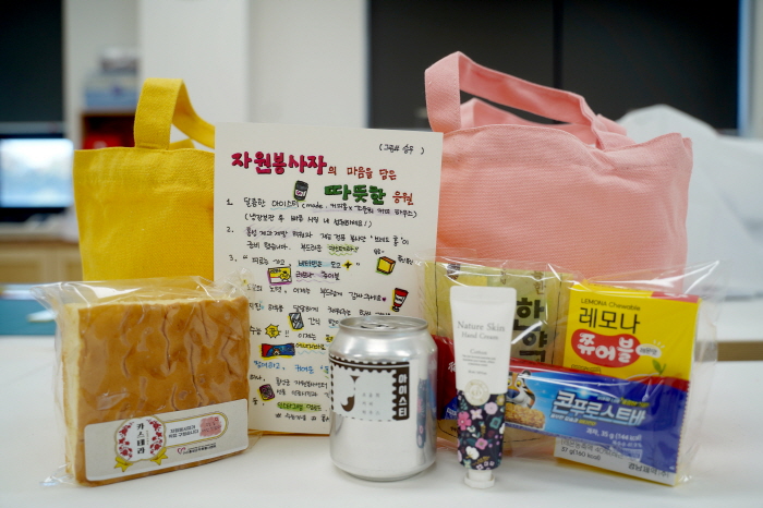 아이스티, 카스테라, 핸드크림, 에너지바, 간식키트 등 일부 품목에서는 직접 손으로 만들어 정성을 더했습니다.