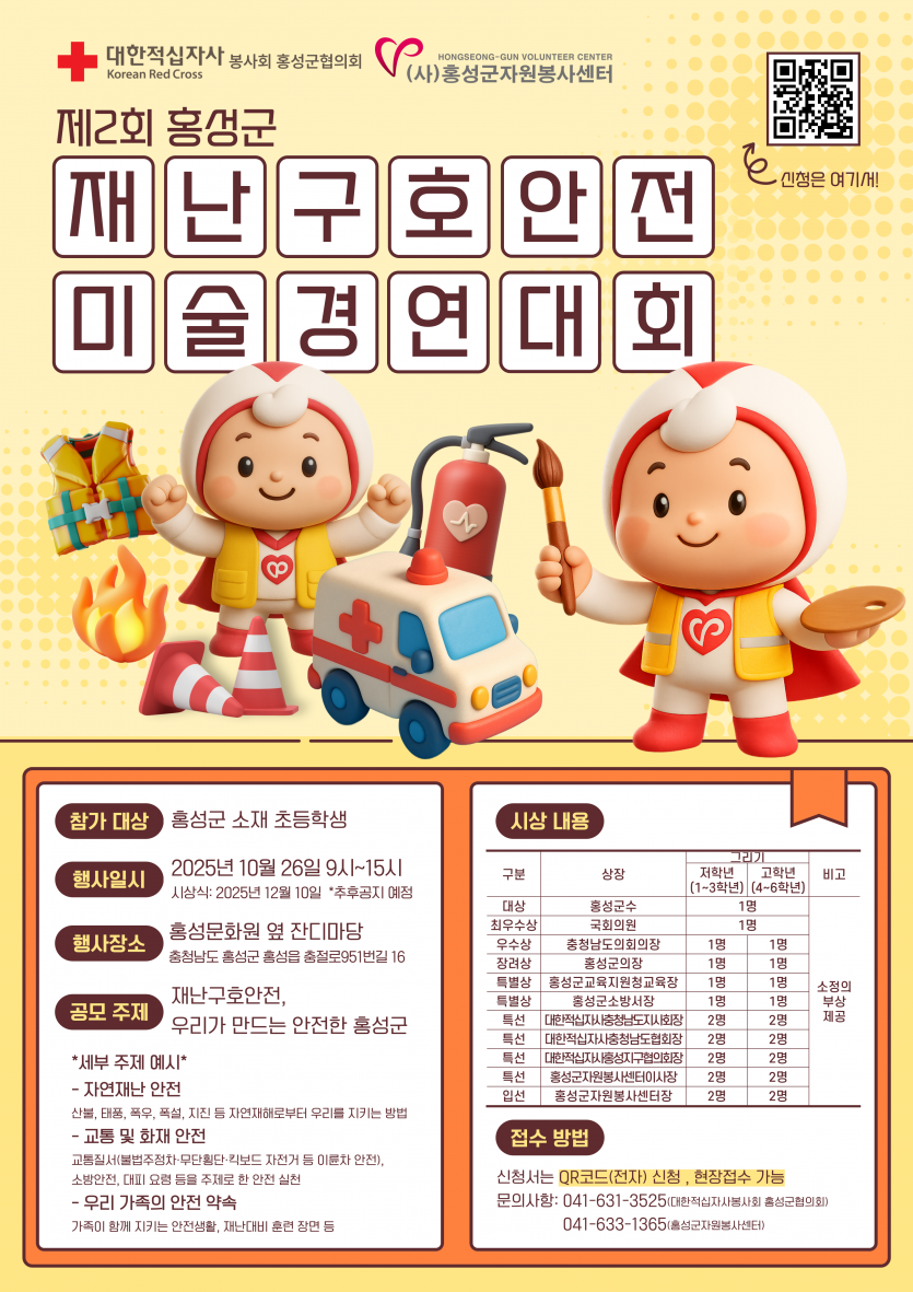 제2회 홍성군 재난구호안전 미술경연대회 페이지 정보 작성자 최고관리자 작성일 25-10-17 15:45 조회 79회 댓글 0건 본문 첨부파일 제2회 홍성군 재난구호안전 미술경연대회 공고문.pdf (96.8K) 4회 다운로드 | DATE : 2025-10-17 15:47:49 이전글홍성군자원봉사센터 2025년 10월 ~ 11월 봉사자 모집 안내 다음글직원(행복마을 코디네이터) 채용 최종 합격자 발표 목록 댓글목록 0 댓글목록 등록된 댓글이 없습니다.