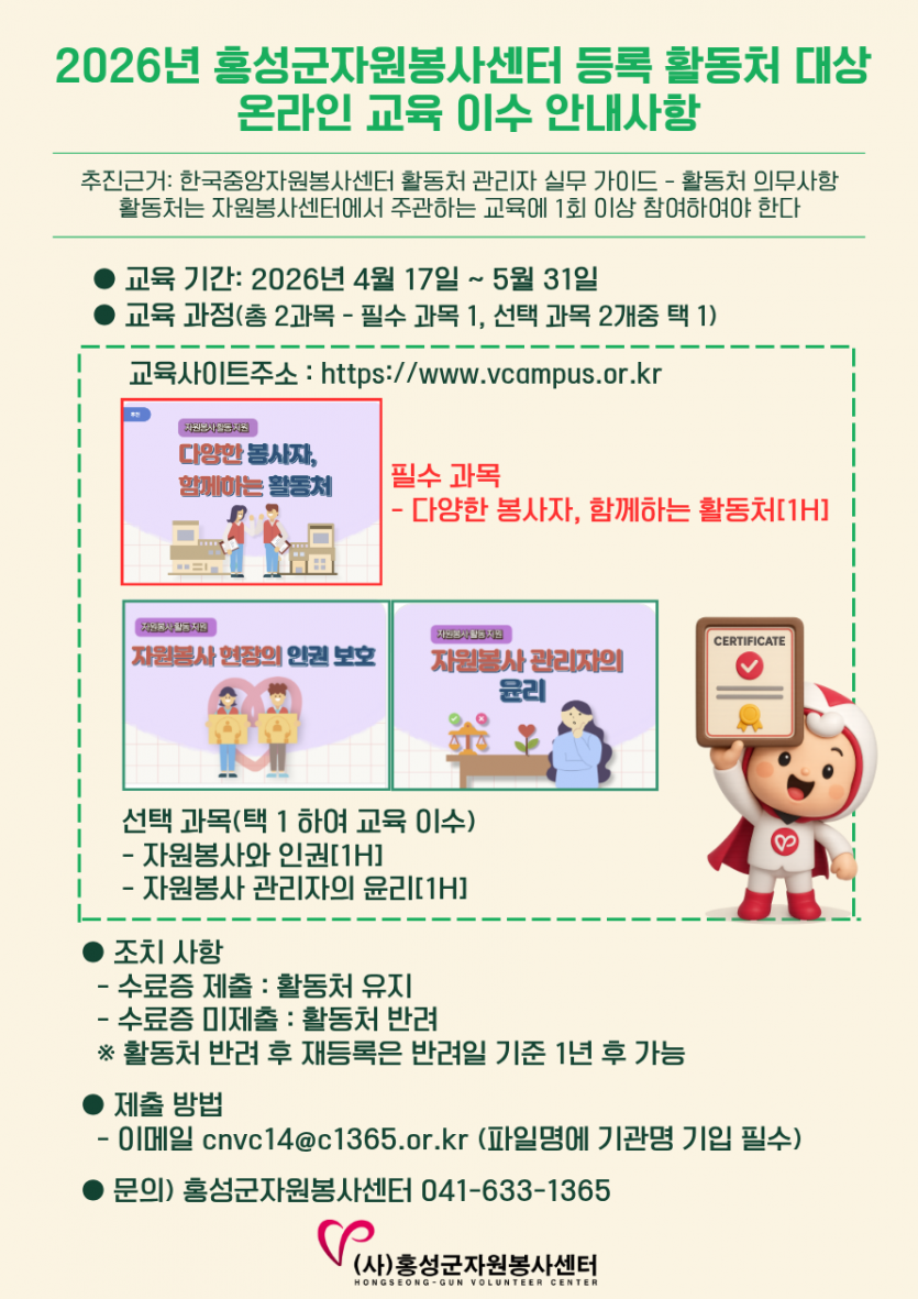 · 사 업 명 : 2026년 홍성군 자원봉사 활동처 대상 온라인 의무 교육 이수