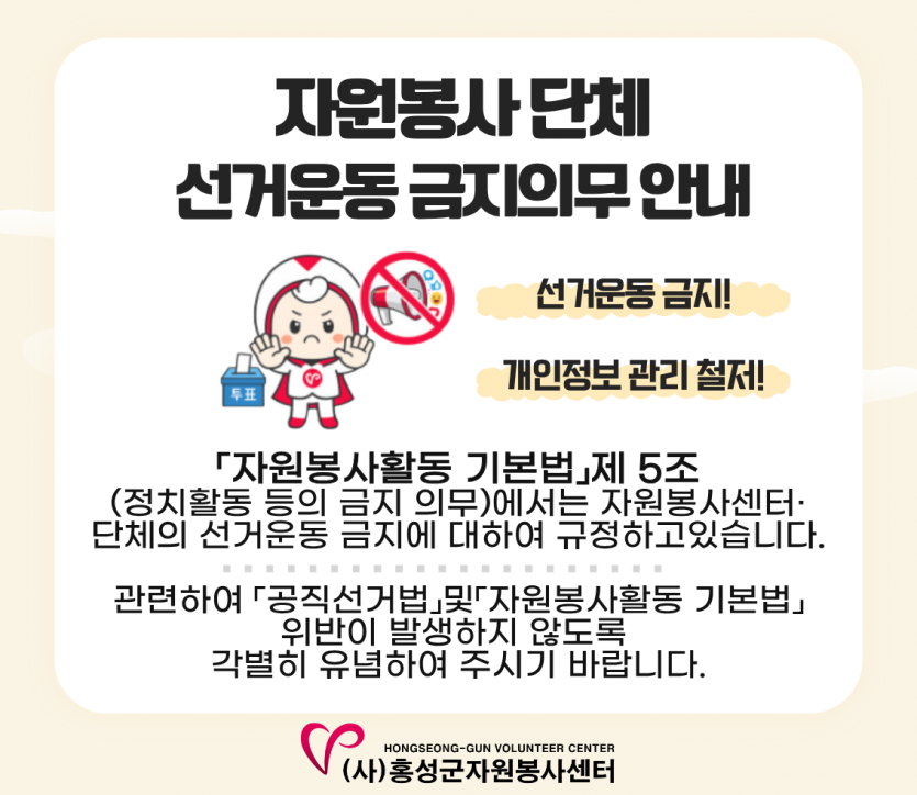 특히 자원봉사 활동 과정에서 특정 정당 또는 후보자에 대한 지지·반대 의사 표현, 홍보물 게시·배포, 관련 발언 및 SNS 게시 등 오해 소지가 있는 행위가 발생하지 않도록 각별한 주의를 부탁드립니다.